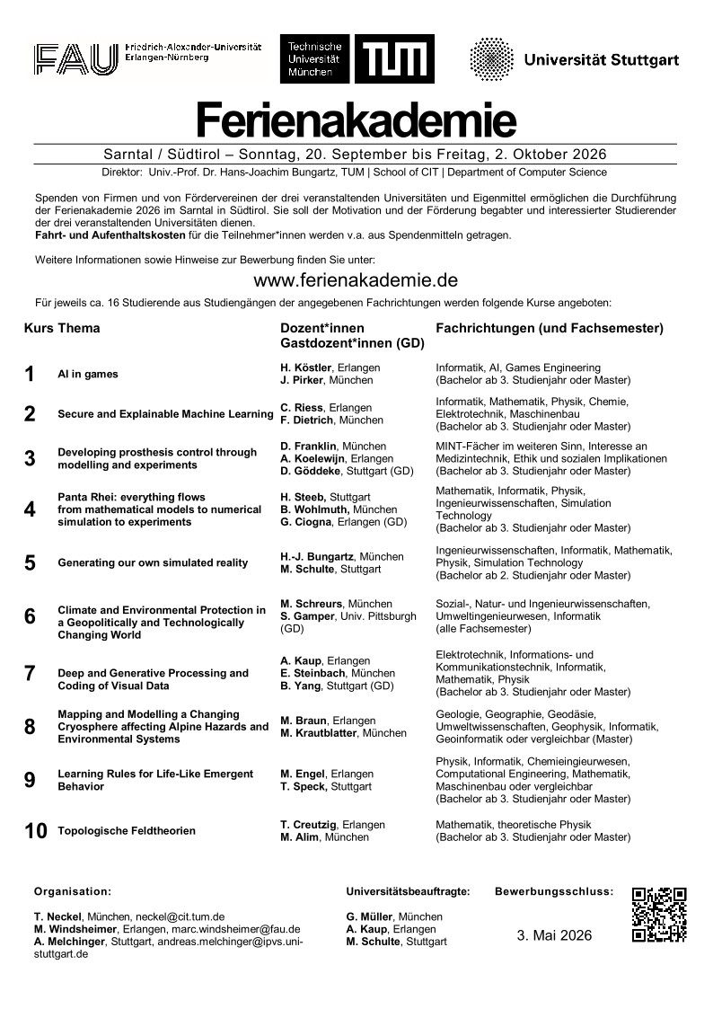 - Mathematik, Informatik, Physik, Ingenieurwissenschaften, Simulation Technology (Bachelor ab 3. Studienjahr oder Master)